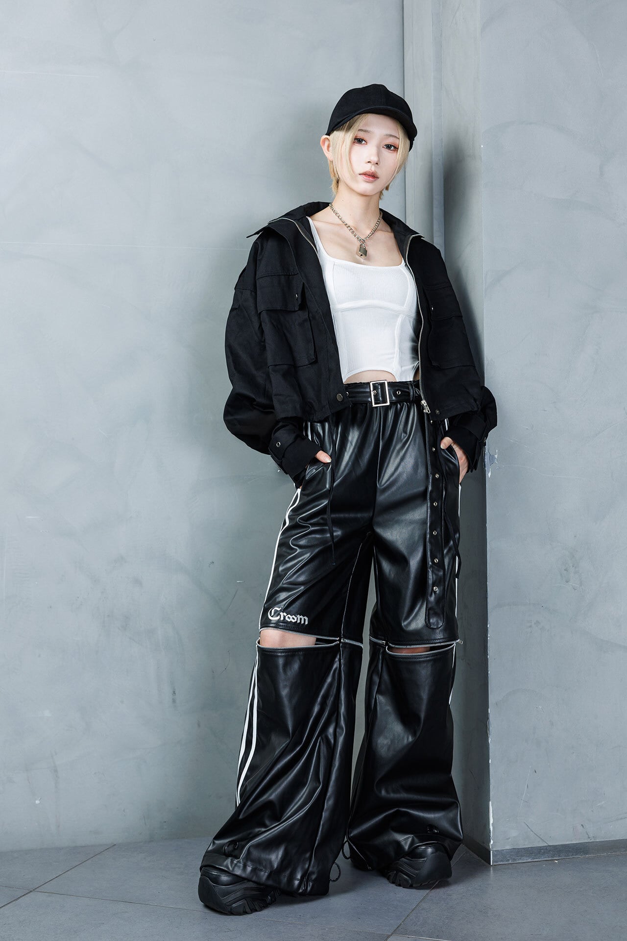 柔らかいフェイクレザー素材で仕立てた3WAYルーズストレートパンツ。