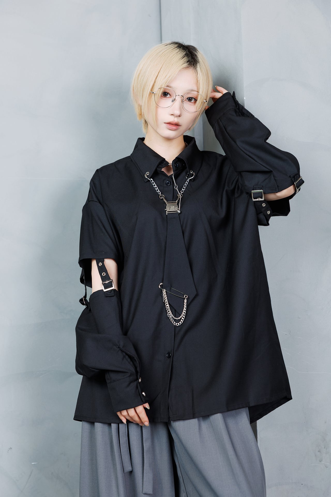 存在感のあるビッグカラーと特徴的なアームベルトがモードな雰囲気を演出する、デザインシャツ。